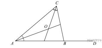 Версия для печати и копирования в MS WordВнешний угол при вершине В треугольника ABC равен 104°. Биссектрисы углов А и С треугольника пересекаются в точке О. Найдите величину угла АОС. Дайте ответ в градусах. Запишите решение и ответ.