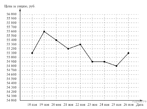 По описанию постройте график зависимости цены на платину (за унцию) от даты в течение девяти дней — с 18 ноября по 26 ноября. Соседние точки соедините отрезками. Точка, показывающая цену платины 18 ноября, уже отмечена на рисунке.