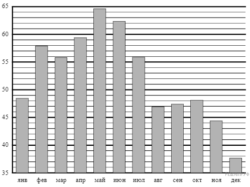 Версия для печати и копирования в MS WordНа диаграмме показана средняя цена нефти в 2015 году по месяцам (в долларах США за 1 баррель).