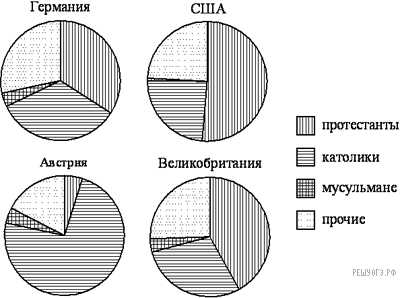 На диаграмме показаны религиозные составы населения Германии, США, Австрии и Великобритании. Определите по диаграмме, в какой стране доля католиков превышает 50%. Ответ напишите в именительном падеже.