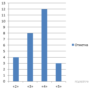 На диаграмме показаны результаты проверочной работы, проведенной в 6 «В» классе. По вертикальной оси указано число учеников. Назовите средний балл тех, кто получил за эту работу оценку ниже «4».